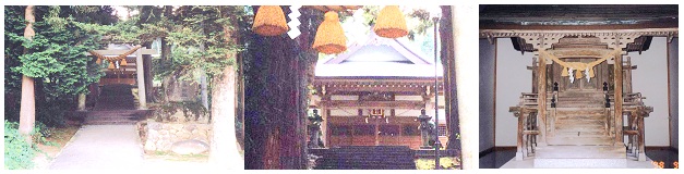 集落の奥、山麓の鬱蒼たる樹林の中に鎮座している。 旧社地は三田部落の東北方の低地水田中にあつたが、井田川水害のため、山寄りの現地に移転したものという。一説では、この水害のとき流失した神体を拾い上げて祀つたのが寺町の白鳥神社であるという。 |