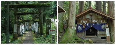 荒神社の夫婦スギ 江名子町4946 昭和51年8月21日 高山市指定天然記念物 このスギは、地上1m余で二本に分かれ、それぞれの周囲が4.83m、4.36mあり、元廻り7.6mの大きなものである。 荒神社の例祭は、四年ごとの正月七日前後に行われ、あま酒祭りと言われる。 例祭日の前日にあま酒を仕込み、翌日五穀餅と共に参拝者にふるまう。 荒神社 高山市教育委員会 社頭掲示板 |